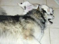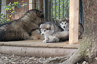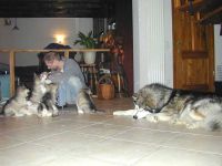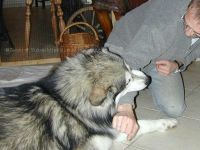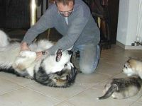 Er ist sehr konsequent mit seinen Rudelmitgliedern und er ist ein absolut toller Vater und "Ersatzvater". Er zieht alle unsere Welpen groß, sie durchlaufen eine strenge Schule, aber andererseits würgt er ihnen sein Futter vor und lässt sie im gebührenden Abstand herumtollen. Nach der Fütterung "seiner" Kinder, seine Natur zwingt ihn dazu, schaut er mich immer ziemlich verzweifelt an, in der Hoffnung einen Nachschlag zu bekommen, welchen er natürlich auch bekommt 😉